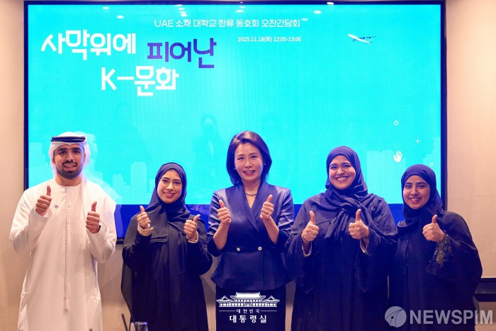 [서울=뉴스핌] 아랍에미리트를 국빈 방문 중인 이재명 대통령의 부인 김혜경 여사가 지난 18일(현지시간) 아부다비에서 UAE 소재 대학 한류 동호회 회원들을 만나 기념촬영을 하고 있다. [사진=대통령실] 2025.11.20 photo@newspim.com