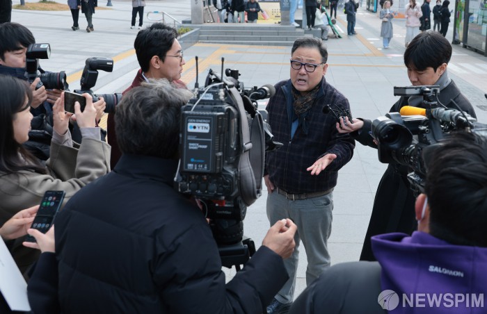 [서울=뉴스핌] 이길동 기자 = 고가 시계 청탁 의혹을 받는 로봇개 판매사 서성빈 드론돔 대표가 20일 오전 서울 종로구 KT광화문빌딩 웨스트에 마련된 김건희 특검 사무실에 출석하며 취재진의 질문에 답하고 있다. 2025.11.20 gdlee@newspim.com