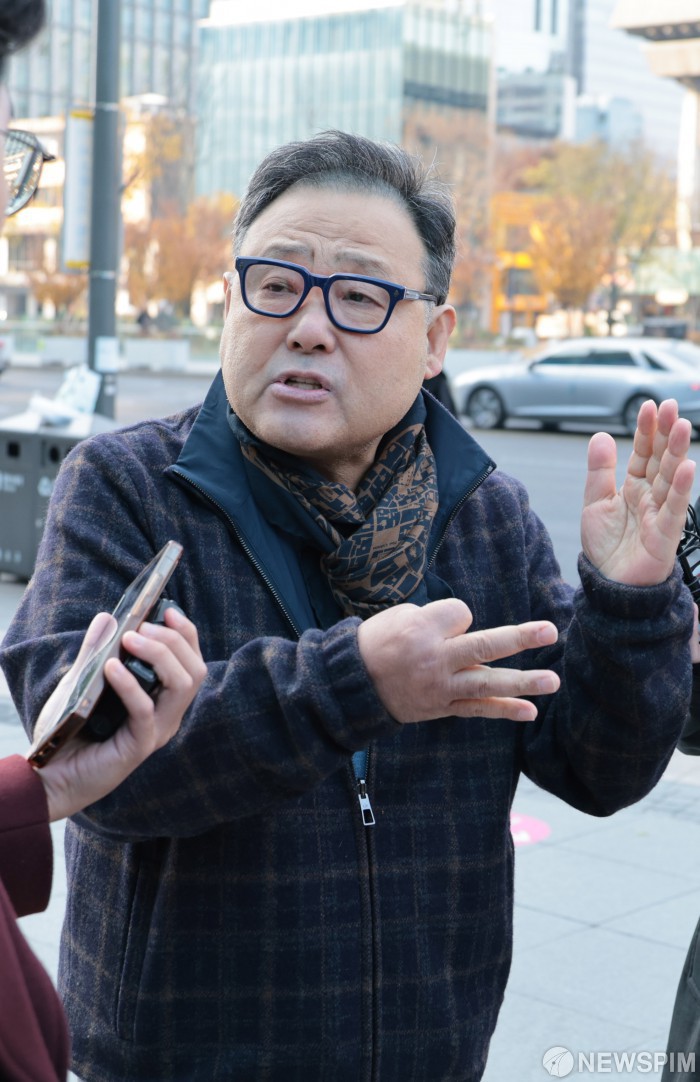 [서울=뉴스핌] 이길동 기자 = 고가 시계 청탁 의혹을 받는 로봇개 판매사 서성빈 드론돔 대표가 20일 오전 서울 종로구 KT광화문빌딩 웨스트에 마련된 김건희 특검 사무실에 출석하며 취재진의 질문에 답하고 있다. 2025.11.20 gdlee@newspim.com
