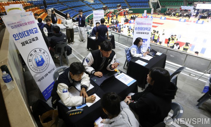 [서울=뉴스핌] 최지환 기자 = 20일 오전 서울 송파구 서울특별시교육청 학생체육관에서 열린 2025학년도 하반기 미래체육인재 한마당에서 체육계열 대학교 진학 희망자들이 진학상담을 받고 있다. 2025.11.20 choipix16@newspim.com
