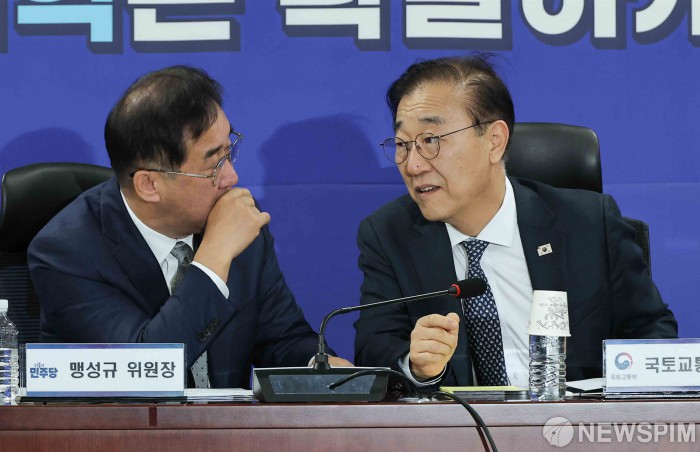 [서울=뉴스핌] 윤창빈 기자 = 김윤덕 국토교통부 장관이 20일 서울 여의도 국회 의원회관에서 열린 더불어민주당 국토위 – 국토교통부 당정협의에서 맹성규 국회 국토교통위원장과 대화를 하고 있다. 2025.11.20 pangbin@newspim.com