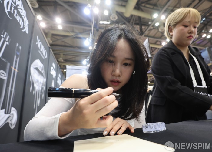 [고양=뉴스핌] 김학선 기자 = 20일 경기도 고양시 킨텍스 2전시장에서 열린 '2025 제1회 한국문신산업박람회(TEXPO)'에서 참가자들이 문신용 색소를 시연해보고 있다. 이번 박람회는 지난 9월 국회를 통과한 '문신사법' 시행을 기점으로, 산업의 합법화 시대를 여는 첫 공식 행사로 오는 22일까지 3일간 개최된다. 2025.11.20 yooksa@newspim.com