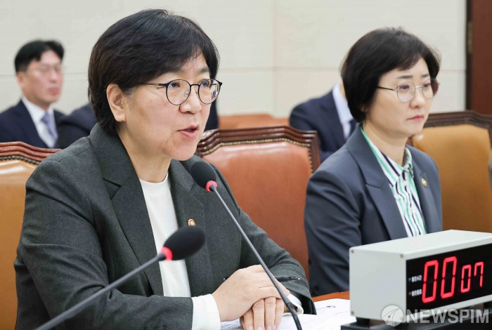 [서울=뉴스핌] 윤창빈 기자 = 정은경 보건복지부 장관이 20일 서울 여의도 국회에서 열린 보건복지위원회 전체회의에서 의원 질문에 답변하고 있다. 2025.11.20 pangbin@newspim.com