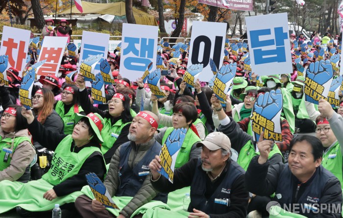 [서울=뉴스핌] 양윤모 기자 =학교에서 급식과 돌봄을 담당하는 비정규직 노동자들이 20일 오후 서울 여의도 국회의사당 앞에서 총파업 대회를 열고 기본급 인상과 방학 중 비근무자 생계대책 마련 등을 촉구하고 있다. 파업 첫날 지역의 교육 당국은 학교별로 빵과 우유 등으로 대체 급식을 실시 했다. 2025.11.20 yym58@newspim.com