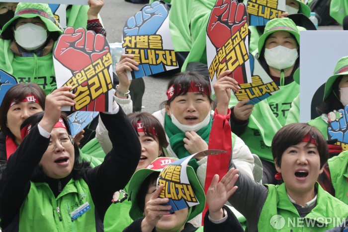 [서울=뉴스핌] 양윤모 기자 =학교에서 급식과 돌봄을 담당하는 비정규직 노동자들이 20일 오후 서울 여의도 국회의사당 앞에서 총파업 대회를 열고 기본급 인상과 방학 중 비근무자 생계대책 마련 등을 촉구하고 있다. 파업 첫날 지역의 교육 당국은 학교별로 빵과 우유 등으로 대체 급식을 실시 했다. 2025.11.20 yym58@newspim.com
