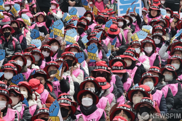 [서울=뉴스핌] 양윤모 기자 =학교에서 급식과 돌봄을 담당하는 비정규직 노동자들이 20일 오후 서울 여의도 국회의사당 앞에서 총파업 대회를 열고 기본급 인상과 방학 중 비근무자 생계대책 마련 등을 촉구하고 있다. 파업 첫날 지역의 교육 당국은 학교별로 빵과 우유 등으로 대체 급식을 실시 했다. 2025.11.20 yym58@newspim.com