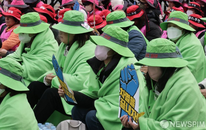 차별을 위해 추위속 집회하는 학교 비정규직 노동자들
