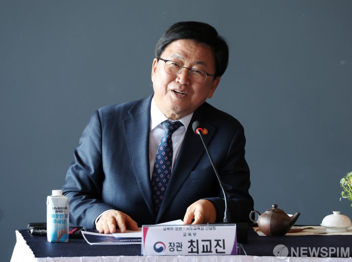 [서울=뉴스핌] 최교진 교육부 장관이 20일 경남 통영 스탠포드 호텔에서 열린 교육부장관-시도교육감 간담회에서 인사말을 하고 있다. 오른쪽은 강은희 전국시도교육감협의회 회장(대구광역시교육감). [사진=교육부] 2025.11.20 photo@newspim.com