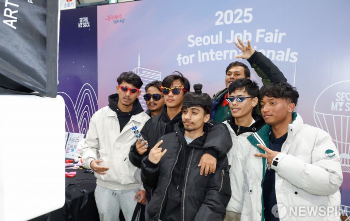 [서울=뉴스핌] 류기찬 기자 = 20일 오후 서울 강남구 세텍 서울무역전시장에서 열린 ‘외국인 취업·채용 박람회'에서 구직자들이 기념촬영을 하고 있다. 2025.11.20 ryuchan0925@newspim.com