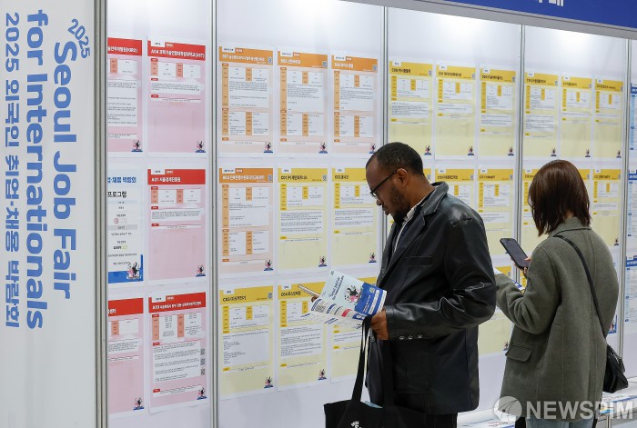 [서울=뉴스핌] 류기찬 기자 = 20일 오후 서울 강남구 세텍 서울무역전시장에서 열린 ‘외국인 취업·채용 박람회'를 찾은 구직자들이 채용공고 게시대를 살펴보고 있다. 2025.11.20 ryuchan0925@newspim.com