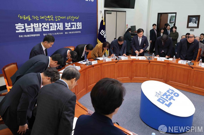 [서울=뉴스핌] 윤창빈 기자 = 정청래 더불어민주당 대표 등 참석자들이 20일 서울 여의도 국회에서 열린 호남발전과제 보고회에서 인사를 하고 있다. 2025.11.20 pangbin@newspim.com