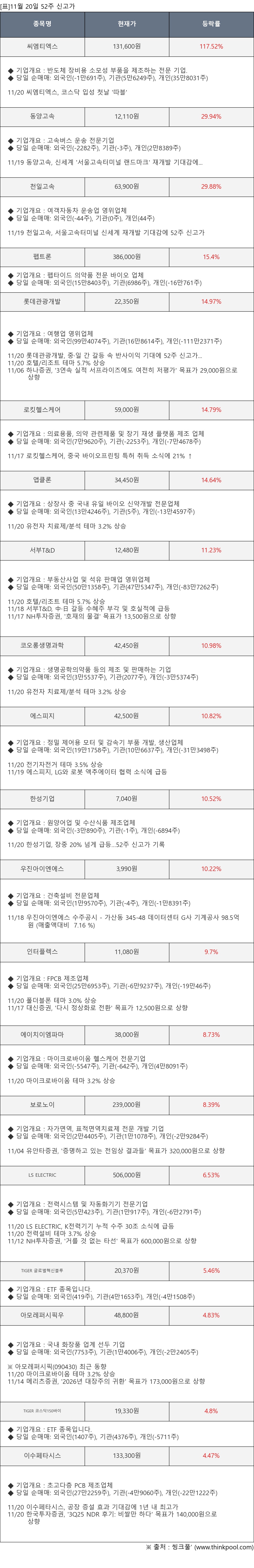※ 관련 종목: 씨엠티엑스, 동양고속, 천일고속, 펩트론, 롯데관광개발, 로킷헬스케어, 앱클론, 서부T&D, 코오롱생명과학, 에스피지, 한성기업, 우진아이엔에스, 인터플렉스, 에이치이엠파마, 보로노이, LS ELECTRIC, TIGER 글로벌혁신블루, 아모레퍼시픽우, TIGER 코스닥150바이, 이수페타시스
