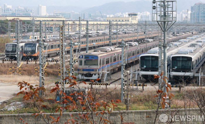 [고양=뉴스핌] 김학선 기자 = 서울지하철 1~8호선을 운영하는 서울교통공사 제1노조인 민주노총 산하 서울교통공사노동조합의 파업 찬반투표가 83.53%로 가결됐다. 1노조는 쟁의대책위 회의를 거쳐 오는 25일 기자회견을 열고 총파업 일정과 총력투쟁 방침을 알릴 예정이다. 앞서 공사 제2노조인 한국노총 소속 서울교통공사통합노조도 지난 14일부터 17일까지 쟁의행위 찬반 투표를 실시했고, 77.97% 찬성으로 가결됐다. 사진은 20일 오후 경기도 고양시 서울교통공사 지축차량기지의 열차 모습. 2025.11.20 yooksa@newspim.com