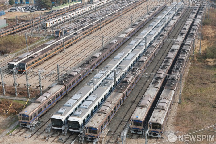 [고양=뉴스핌] 김학선 기자 = 서울지하철 1~8호선을 운영하는 서울교통공사 제1노조인 민주노총 산하 서울교통공사노동조합의 파업 찬반투표가 83.53%로 가결됐다. 1노조는 쟁의대책위 회의를 거쳐 오는 25일 기자회견을 열고 총파업 일정과 총력투쟁 방침을 알릴 예정이다. 앞서 공사 제2노조인 한국노총 소속 서울교통공사통합노조도 지난 14일부터 17일까지 쟁의행위 찬반 투표를 실시했고, 77.97% 찬성으로 가결됐다. 사진은 20일 오후 경기도 고양시 서울교통공사 지축차량기지의 열차 모습. 2025.11.20 yooksa@newspim.com