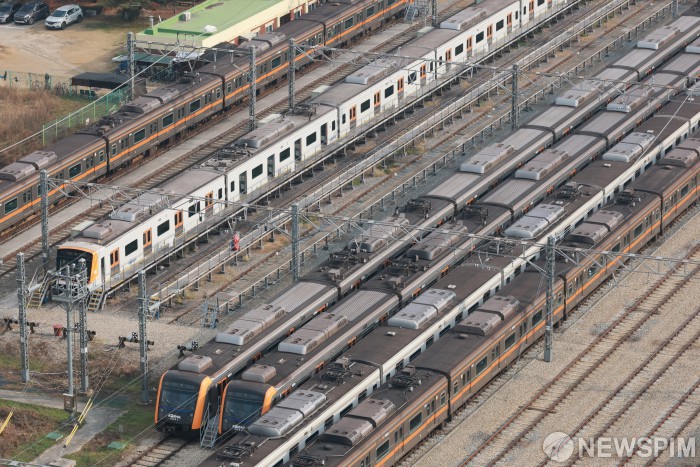 [고양=뉴스핌] 김학선 기자 = 서울지하철 1~8호선을 운영하는 서울교통공사 제1노조인 민주노총 산하 서울교통공사노동조합의 파업 찬반투표가 83.53%로 가결됐다. 1노조는 쟁의대책위 회의를 거쳐 오는 25일 기자회견을 열고 총파업 일정과 총력투쟁 방침을 알릴 예정이다. 앞서 공사 제2노조인 한국노총 소속 서울교통공사통합노조도 지난 14일부터 17일까지 쟁의행위 찬반 투표를 실시했고, 77.97% 찬성으로 가결됐다. 사진은 20일 오후 경기도 고양시 서울교통공사 지축차량기지의 열차 모습. 2025.11.20 yooksa@newspim.com