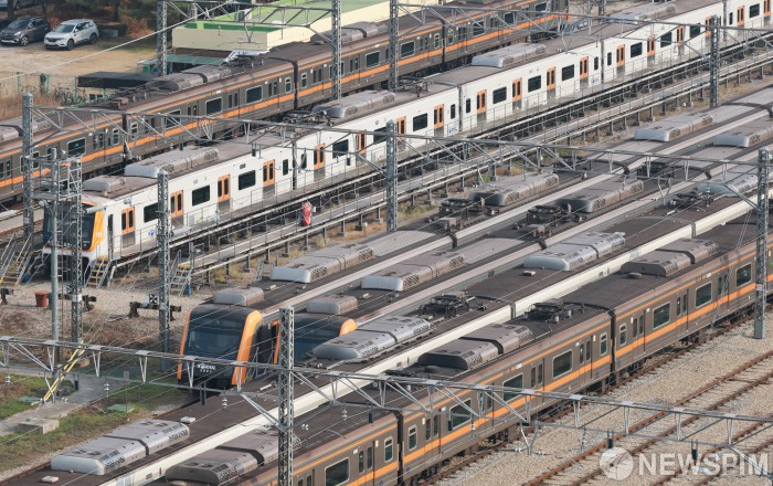 [고양=뉴스핌] 김학선 기자 = 서울지하철 1~8호선을 운영하는 서울교통공사 제1노조인 민주노총 산하 서울교통공사노동조합의 파업 찬반투표가 83.53%로 가결됐다. 1노조는 쟁의대책위 회의를 거쳐 오는 25일 기자회견을 열고 총파업 일정과 총력투쟁 방침을 알릴 예정이다. 앞서 공사 제2노조인 한국노총 소속 서울교통공사통합노조도 지난 14일부터 17일까지 쟁의행위 찬반 투표를 실시했고, 77.97% 찬성으로 가결됐다. 사진은 20일 오후 경기도 고양시 서울교통공사 지축차량기지의 열차 모습. 2025.11.20 yooksa@newspim.com