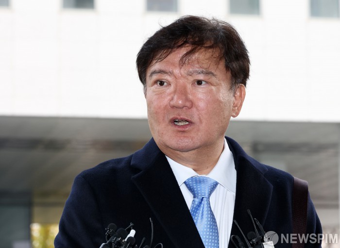 [서울=뉴스핌] 최지환 기자 = 민경욱 전 국회의원이 20일 오후 서울 양천구 서울남부지방법원에서 열린 '국회 패스트트랙(신속처리안건) 충돌 사건' 관련 1심 선고 공판에 출석하며 취재진 질문에 답변하고 있다. 2025.11.20 choipix16@newspim.com