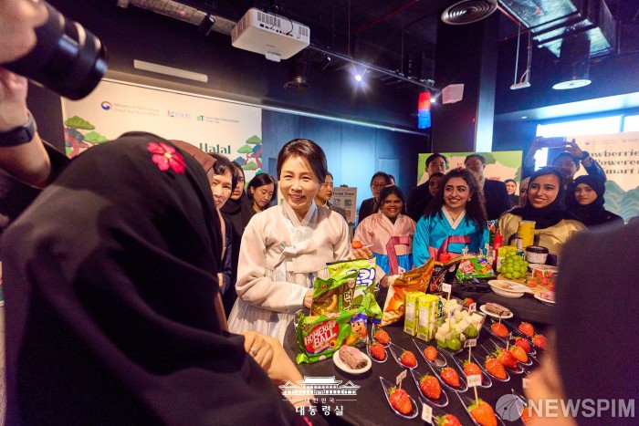 [서울=뉴스핌] 이재명 대통령 부인 김혜경 여사가 19일(현지시간) 아랍에미리트(UAE) 아부다비의 한국문화원에서 열린 '할랄 K-푸드' 홍보 행사장을 둘러보고 있다. [사진=대통령실] 2025.11.20 photo@newspim.com