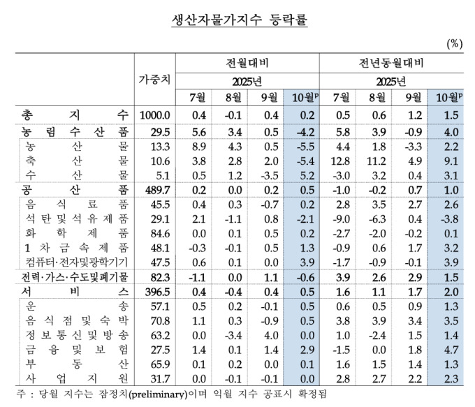 공산품은 컴퓨터·전자 및 광학기기(3.9%), 1차금속제품(1.3%) 등이 올라 전월대비 0.5% 상승했다.