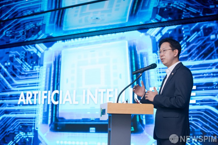 [서울=뉴스핌] 배경훈 부총리 겸 과학기술정보통신부 장관이 20일 경기 성남시 HD현대글로벌R&D센터에서 열린 'HD현대-UNIST 조선해양산업 AI MOU 체결식'에서 축사를 하고 있다. [사진=과학기술정보통신부] 2025.11.20 photo@newspim.com