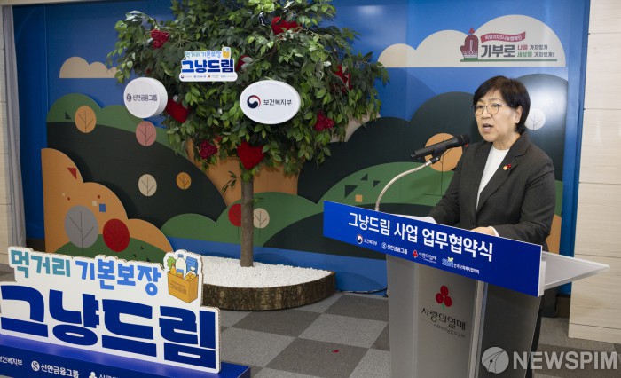 [서울=뉴스핌] 정은경 보건복지부 장관이 20일 서울 중구 사회복지공동모금회관에서 열린 먹거리 기본보장 그냥드림 사업 업무협약식에서 인사말을 하고 있다. [사진=보건복지부] 2025.11.20 photo@newspim.com