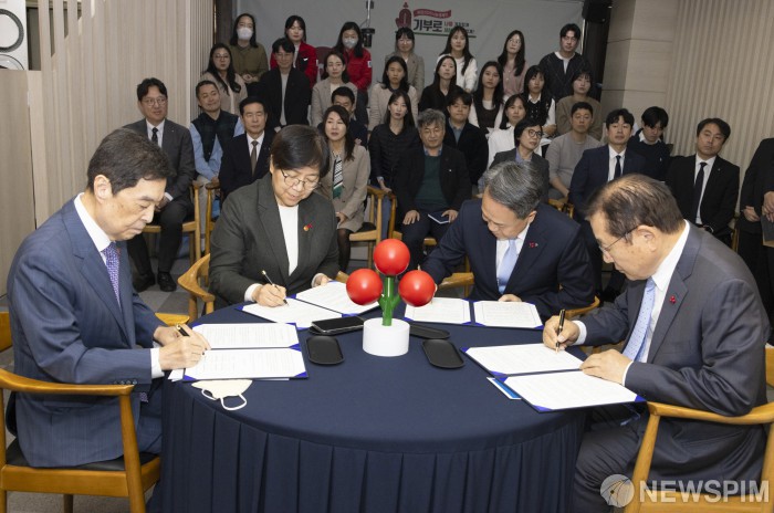 [서울=뉴스핌] 정은경 보건복지부 장관이 20일 서울 중구 사회복지공동모금회관에서 열린 먹거리 기본보장 그냥드림 사업 업무협약식에 서명을 하고 있다. [사진=보건복지부] 2025.11.20 photo@newspim.com