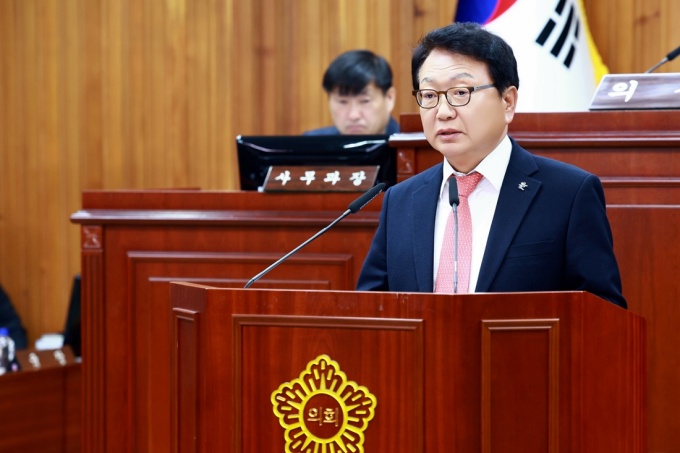 [울진=뉴스핌] 남효선 기자 = 손병복 경북 울진군수가 20일 울진군의회 본회의장에서 속개된 제288회 제2차 정례회에서 2026년도 새해 예산안 제출에 따른 시정연설을 하고 있다. 손 군수는 "탈원전 정책, 태풍 미탁, 코로나 팬데믹, 대형 산불, 고물가.고환율.고금리의 '3고', 인구 감소 등에 따른 침체된 지역 경제 회복을 위해 '원자력 수소 국가 산단' 프로젝트를 울진군의 미래 성장 동력으로 찾았다"며 △원자력수소국가산업단지 추진 통한 '대한민국 K-에너지 대표 도시' 건설 △교육 발전특구 시범사업 및 K-U시티 프로젝트 연계한 대학교 유치 △사계절 오션 리조트 중심의 울진 관광 대도약 △농·임·어업 등 기반 산업 대전환 △군민 중심 '울진형 복지' 고도화 등을 군정 전략적 방향으로 제시했다. 울진군은 7084억 원 규모의 2026년 예산안을 편성해 울진군의회에 제출했다. 이는 2025년 대비 7.8% 증가한 규모이다.2025.11.20. nulcheon@newspim.com