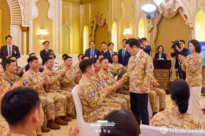 [서울=뉴스핌] 아랍에미리트(UAE)를 국빈 방문 중인 이재명 대통령이 지난 19일(현지시간) UAE에 파견된 아크부대 장병들을 만나 악수를 하고 있다. [사진=대통령실] 2025.11.20 photo@newspim.com