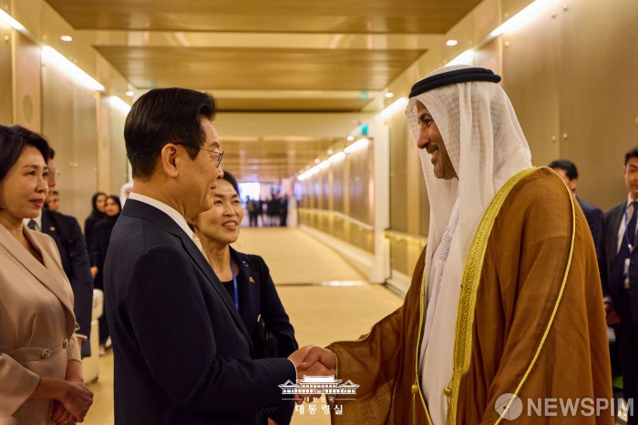 [서울=뉴스핌] 이재명 대통령이 19일(현지시간) 오후 아랍에미리트(UAE)에서의 2박 3일간의 국빈 일정을 마치고 이집트로 출발하며 인사를 나누고 있다. [사진=대통령실] 2025.11.20 photo@newspim.com
