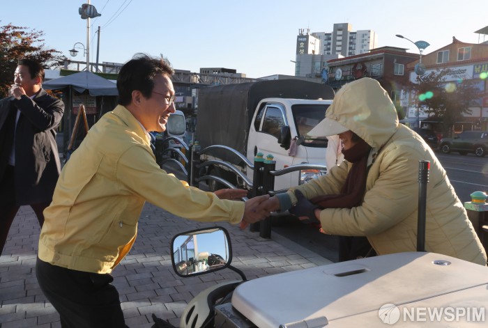 [서울=뉴스핌] 청사사진기자단 = 동절기 해양안전사고 예방 현장점검에 나선 김민석 국무총리가 21일 오전 인천 중구 인천연안여객터미널 운항관리센터를 방문해 점검을 마친 가운데 터미널 앞 상인과 인사를 하고 있다 2025.11.21 photo@newspim.com