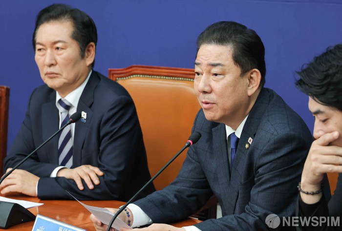 [서울=뉴스핌] 윤창빈 기자 = 김병기 더불어민주당 원내대표가 21일 서울 여의도 국회에서 열린 최고우원회의에서 모두발언을 하고 있다. 2025.11.21 pangbin@newspim.com