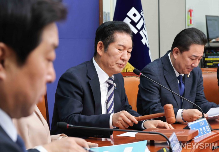 [서울=뉴스핌] 윤창빈 기자 = 정청래 더불어민주당 대표가 21일 서울 여의도 국회에서 열린 최고우원회의에서 의사봉을 두드리고 있다. 2025.11.21 pangbin@newspim.com