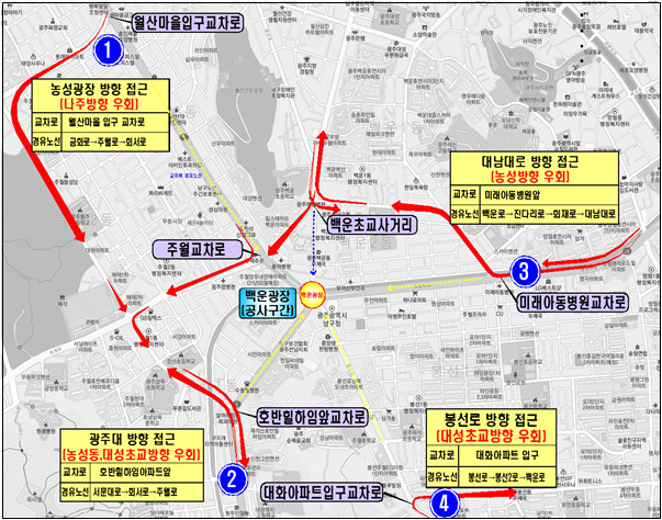 통제 구간 차량 우회도로는 ▲농성교차로에서 백운광장 방향 → 월산마을 입구 교차로에서 양궁장 방향 ▲광주대에서 백운광장 → 호반힐하임 교차로에서 양궁장 방향 ▲남광주(봉선·방림)에서 백운광장 → 미래아동병원 교차로에서 기독병원(수피아여고) 방향 ▲봉선동에서 백운광장 방향 → 대화아파트 입구 교차로에서 봉선중앙로(봉선초교) 방향 등이다.