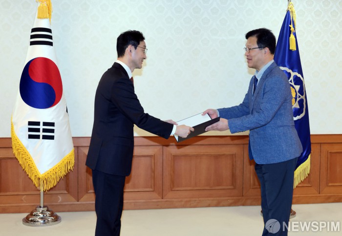 [서울=뉴스핌] 이길동 기자 = 윤창렬 국무조정실장(왼쪽)이 21일 오전 서울 종로구 정부서울청사에서 열린 헌법존중 정부혁신TF 자문단 위촉식에서 윤태범 방송통신대 행정학과 교수에게 위촉장을 수여하고 있다. 2025.11.21 gdlee@newspim.com