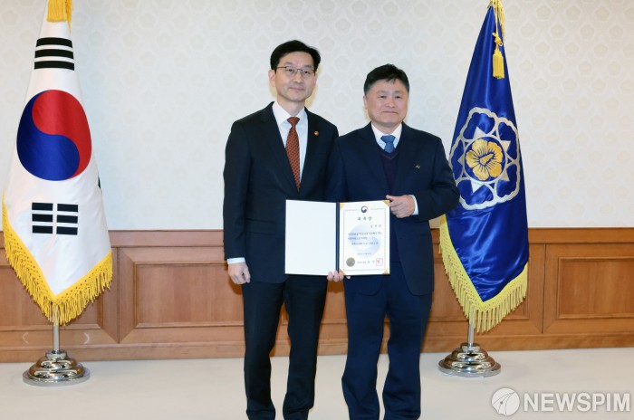 [서울=뉴스핌] 이길동 기자 = 윤창렬 국무조정실장(왼쪽 )이 21일 오전 서울 종로구 정부서울청사에서 열린 헌법존중 정부혁신TF 자문단 위촉식에서 김정민 법무법인 열린사람들 대표 변호사에게 위촉장 수여후 기념촬영을 하고 있다.왼쪽부터 윤태범 방송통신대 행정학과 교수, 윤창렬 국조실장, 김정민 법무법인 열린사람들 대표 변호사,임태훈 군인권센터 소장. 2025.11.21 gdlee@newspim.com