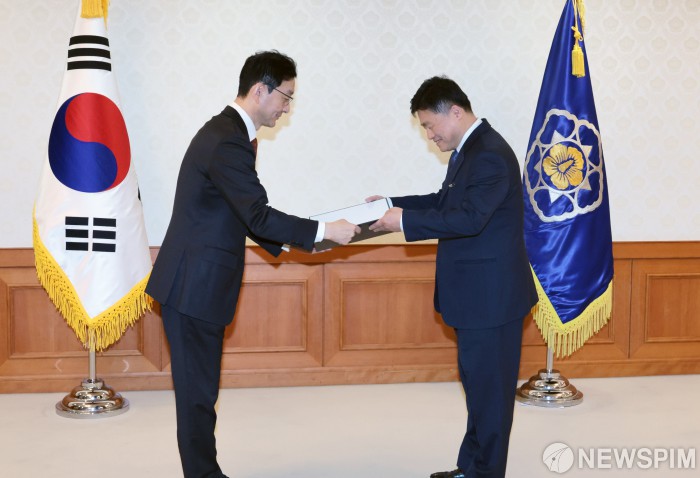 [서울=뉴스핌] 이길동 기자 = 윤창렬 국무조정실장(왼쪽 )이 21일 오전 서울 종로구 정부서울청사에서 열린 헌법존중 정부혁신TF 자문단 위촉식에서 김정민 법무법인 열린사람들 대표 변호사에게 위촉장 수여후 기념촬영을 하고 있다. 2025.11.21 gdlee@newspim.com