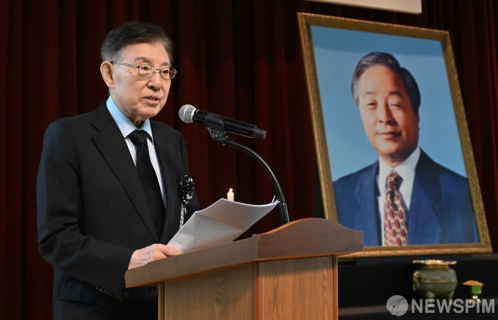 [서울=뉴스핌] 류기찬 기자 = 김덕룡 김영삼민주센터 이사장이 21일 오전 서울 동작구 국립서울현충원 현충관에서 열린 고(故) 김영삼 전 대통령 서거 10주기 추모식에서 인사말을 하고 있다. 2025.11.21 ryuchan0925@newspim.com