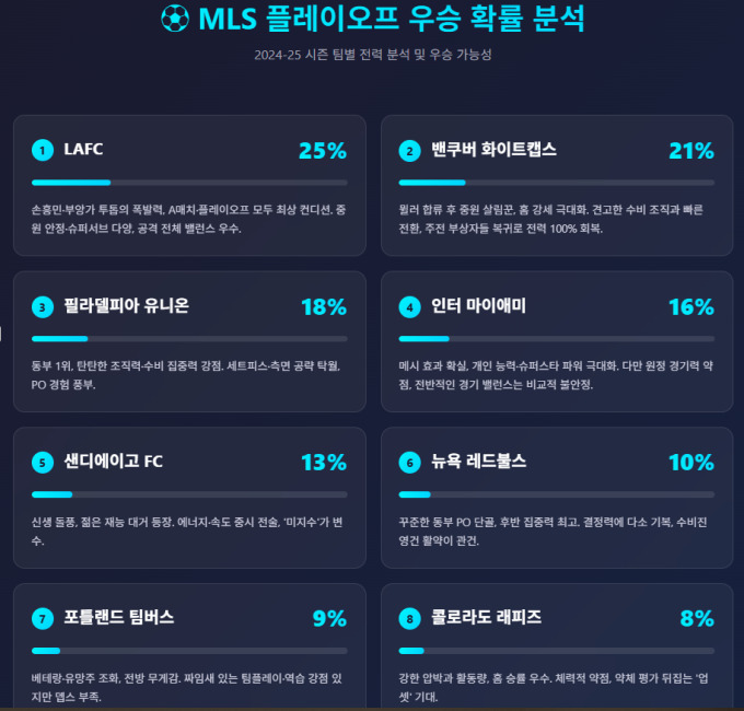 | [서울=뉴스핌] 장환수 스포츠전문기자= AI 퍼플렉시티가 분석한 MLS 플레이오프 우승 확률. [그래픽=클로드로 작성] 2025.11.21 zangpabo@newspim.com |