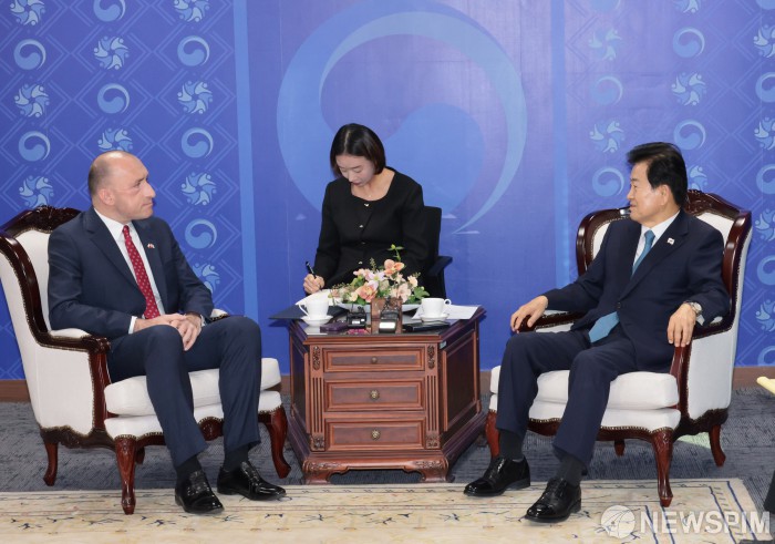 [서울=뉴스핌] 이길동 기자 =정동영 통일부 장관이 21일 오전 서울 종로구 정부서울청사에서 바르토시 비시니에프스키 주한 폴란드 대사를 접견하고 있다. 2025.11.21 gdlee@newspim.com