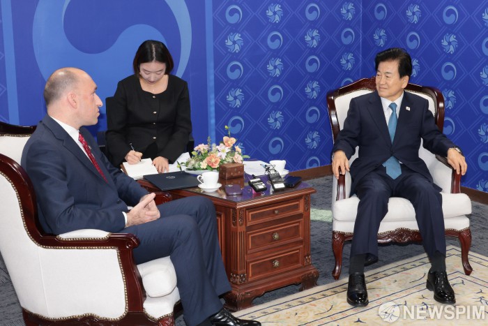 [서울=뉴스핌] 이길동 기자 =정동영 통일부 장관이 21일 오전 서울 종로구 정부서울청사에서 바르토시 비시니에프스키 주한 폴란드 대사를 접견하고 있다. 2025.11.21 gdlee@newspim.com