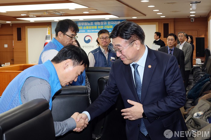 [서울=뉴스핌] 윤호중 행정안전부 장관이 21일 서울 종로구 정부서울청사에서 열린 공무원노조와의 소통강화를 위한 간담회에서 노조위원장들과 인사하고 있다. [사진=행정안전부] 2025.11.21 photo@newspim.com