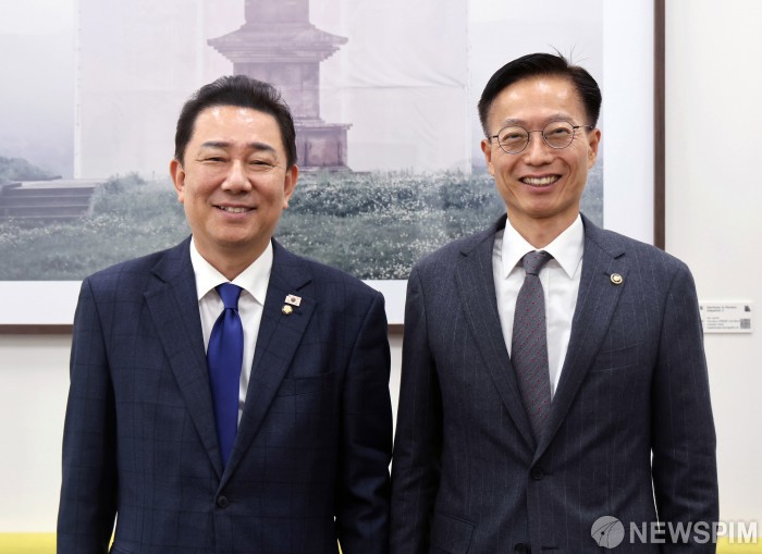 [서울=뉴스핌] 김용선 지식재산처장(오른쪽)이 21일 서울 여의도 국회에서 김병기 더불어민주당 원내대표과 면담을 한 뒤 기념촬영을 하고 있다. [사진=지식재산처] 2025.11.21 photo@newspim.com