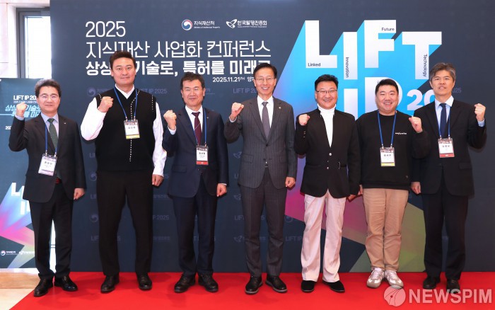 [서울=뉴스핌] 김용선 지식재산처장(오른쪽)이 21일 서울 강남구 엘타워에서 열린 2025 지식재산 사업화 컨퍼런스(LIFT IP 2025)에서 참석자들과 기념촬영을 하고 있다. [사진=지식재산처] 2025.11.21 photo@newspim.com