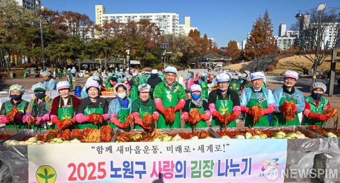 [서울=뉴스핌] 양윤모 기자 = 오승록 노원구청장이 21일 오전, 중계근린공원에서 열린 '2025 사랑의 김장나누기’ 행사에 참석해 참여자들과 단체사진을 찍고 있다. '사랑의 김장 나누기 행사'는 지역 내 다문화가정과 저소득 계층 가구에 김장김치를 지원하기 위해 마련된 것으로, 20일부터 21일까지 이틀간 진행됐다. 이날 현장에서 담근 김장 김치는 총 400박스(각 9kg)로 독거 어르신, 장애인 세대, 다문화가정 등에 전달될 예정이다. [사진=노원구청 ] 2025.11.21 yym58@newspim.com