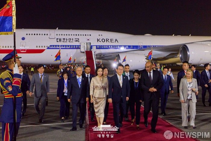 [서울=뉴스핌] 이재명 대통령과 김혜경 여사가 지난 20일(현지시간) 이집트 카이로 국제공항에 도착해 이동하고 있다. [사진=대통령실] 2025.11.21 photo@newspim.com
