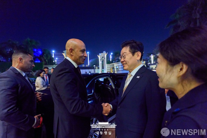 [서울=뉴스핌] 이재명 대통령이 지난 20일(현지시간) 이집트 카이로 국제공항에서 환영 인사들과 악수를 하고 있다. [사진=대통령실] 2025.11.21 photo@newspim.com