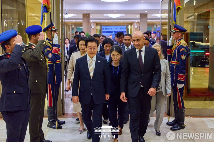 [서울=뉴스핌] 이재명 대통령과 김혜경 여사가 지난 20일(현지시간) 이집트 카이로 국제공항에 도착해 이동하고 있다. [사진=대통령실] 2025.11.21 photo@newspim.com