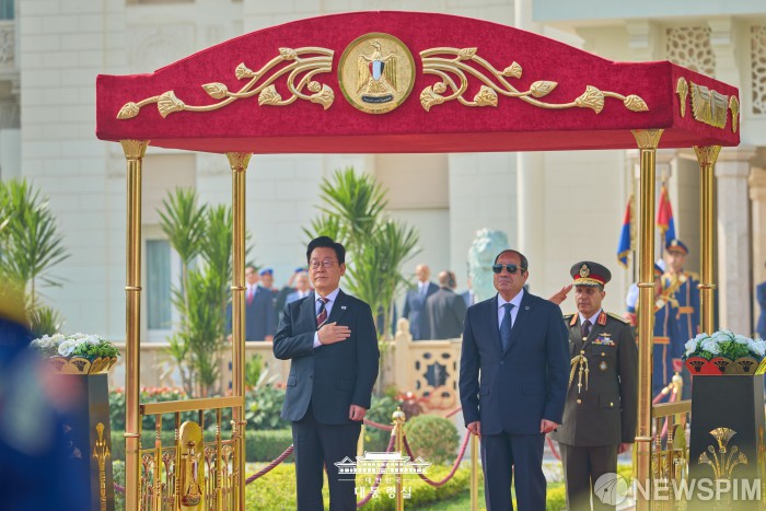 [서울=뉴스핌] 이집트를 공식 방문 중인 이재명 대통령이 지난 20일(현지시간) 카이로 대통령궁에서 열린 공식 환영식에서 국기에 대한 경례를 하고 있다. [사진=대통령실] 2025.11.21 photo@newspim.com