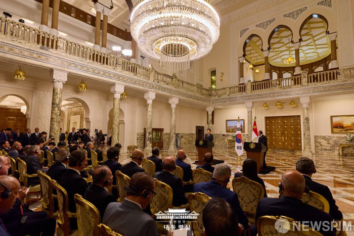 [서울=뉴스핌] 이집트를 공식 방문 중인 이재명 대통령이 지난 20일(현지시간) 카이로 대통령궁에서 압델 파타 알시시 대통령과 한-이집트 공동언론발표를 하고 있다. [사진=대통령실] 2025.11.21 photo@newspim.com