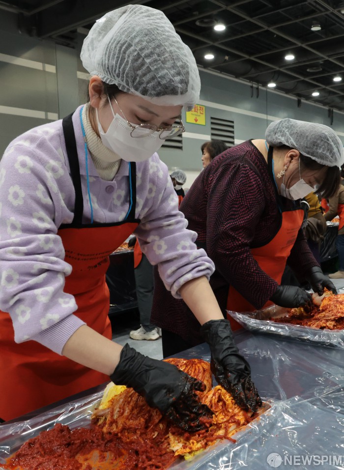 [서울=뉴스핌] 이길동 기자 = 김치의 날인 22일 서울 서초구 양재동 aT센터 열린 ' 2025 대한민국 김장대축제' 대한민국 김치명인과 함께하는 김치담그기 행사에서 다문화 가족, 외국인 명예시민 등 참가자들이 김치을 담그고 있다. 2025.11.22 gdlee@newspim.com